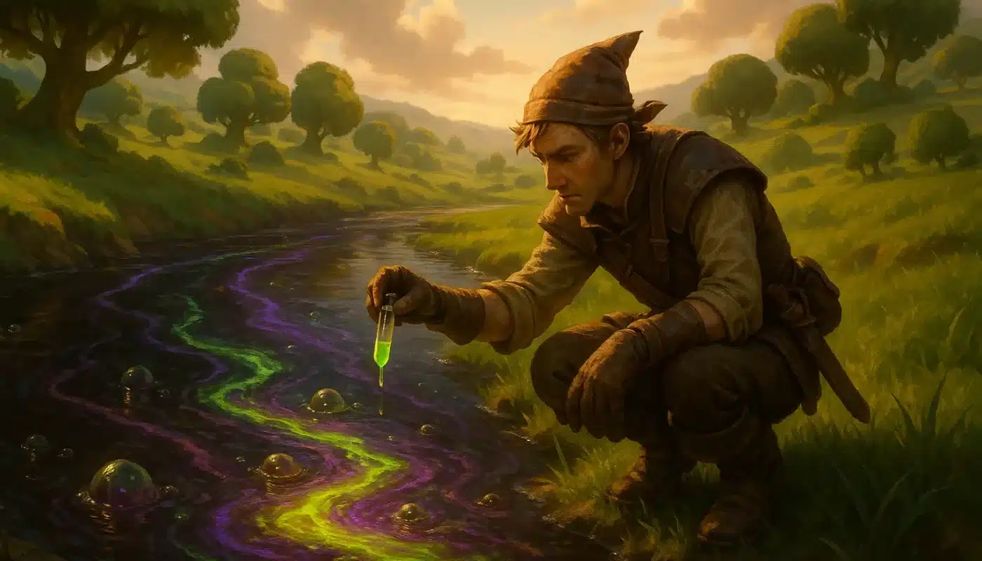 Direction les ateliers locaux. Emia Elliesol, agacée, confirme que « tout est contaminé ». Unterix Unter, éleveur peu coopératif, jette l’éponge : « J’ai arrêté la chasse, mais j’sais pas d’où ça vient. Débrouillez-vous ! » Nibé Lulle, alchimiste suspicieux, pointe un lien avec un refus de subventionner une carrière : « Ces politiciens nous tuent tous. » En suivant sa piste, on découvre Fidel Gastro, le coupable : il a contaminé la rivière en y essorant des chiffons imbibés de moisissures. Résultat ? Eau contaminée → céréales toxiques → animaux malades → flore infectée. Une déflagration de TNT plus tard, le mystère est résolu. Rester à convaincre Paule Amploa que tout est sous contrôle suffira.