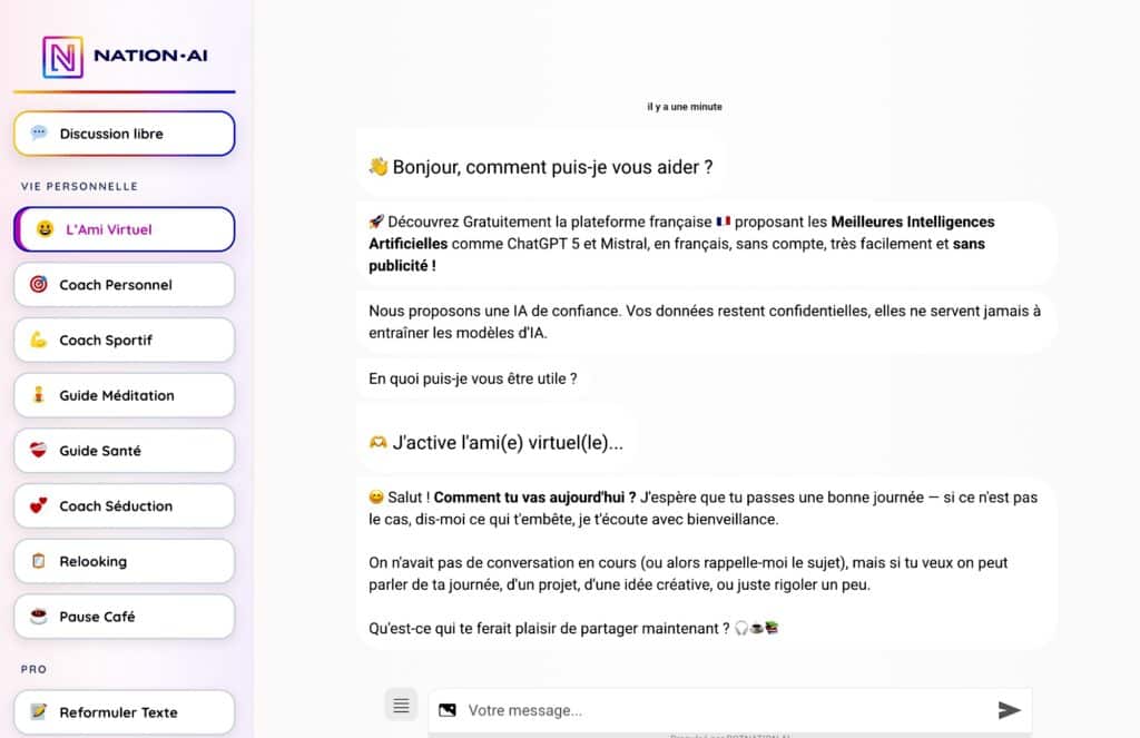 L’un des atouts phares de Nation réside dans la diversité de ses assistants IA spécialisés. Plutôt que de proposer un outil unique multifonction, la plateforme offre des modules ciblés : coach sportif, guide bien-être, correcteur de texte, conseiller administratif, accompagnement juridique ou encore appui aux études. Chacun de ces assistants a été conçu avec le souci d’obtenir des résultats pertinents et adaptés à chaque situation.