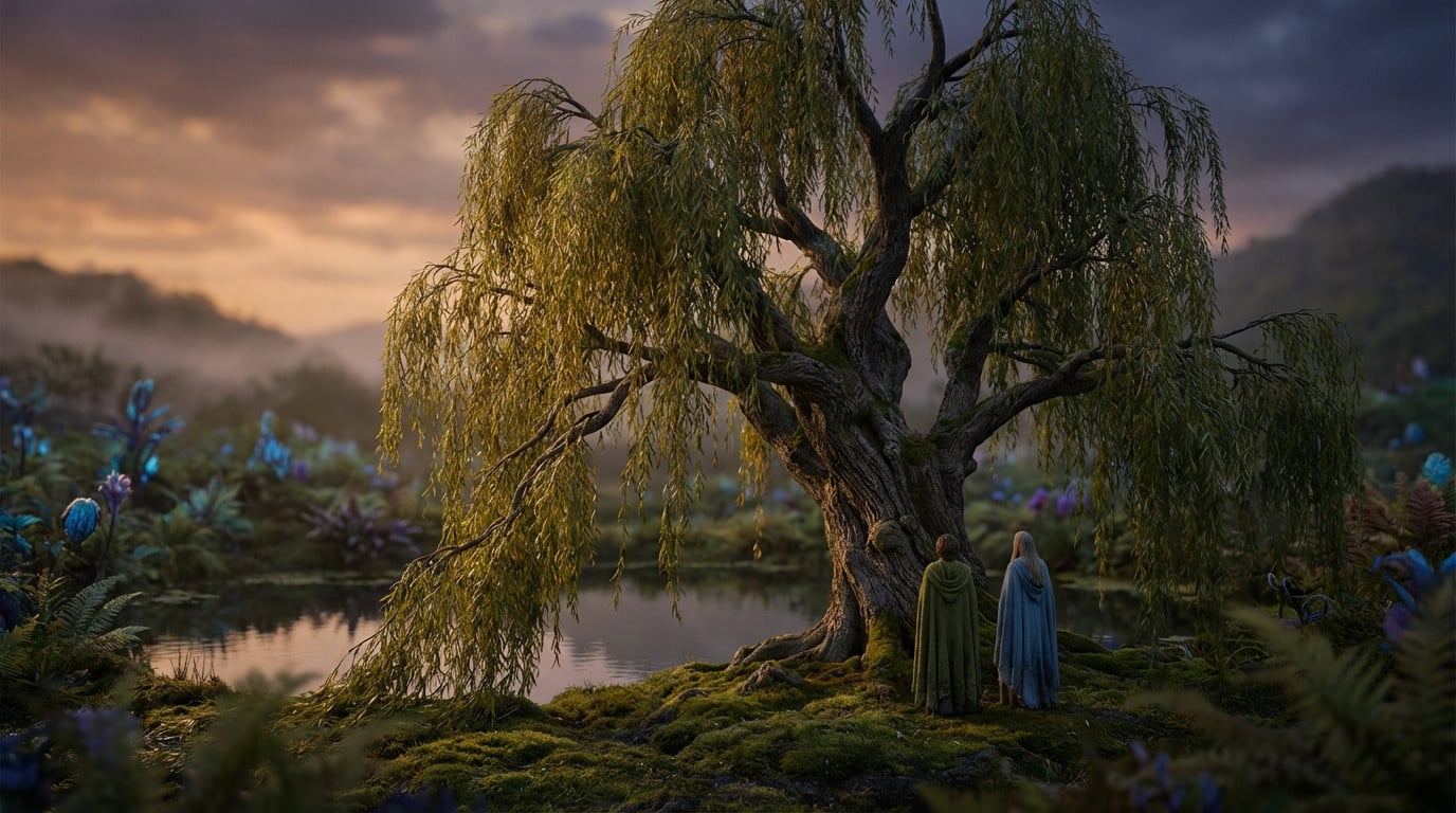 Je suis l’esprit de ce saule. Par amour pour toi, j’ai pris cette forme, mais mon existence s’éteint avec lui. Notre histoire était vouée à cette fin.